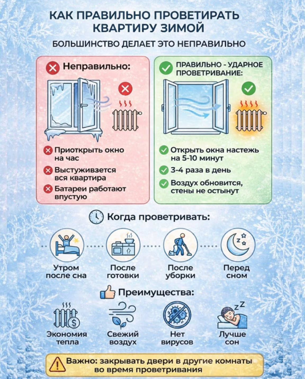 С наступлением холодов хочется плотно закрыть окна и устроиться в тепле. Но, зимнее проветривание — это не просто полезная привычка, а необходимость для вашего здоровья и сохранности имущества. ❄️