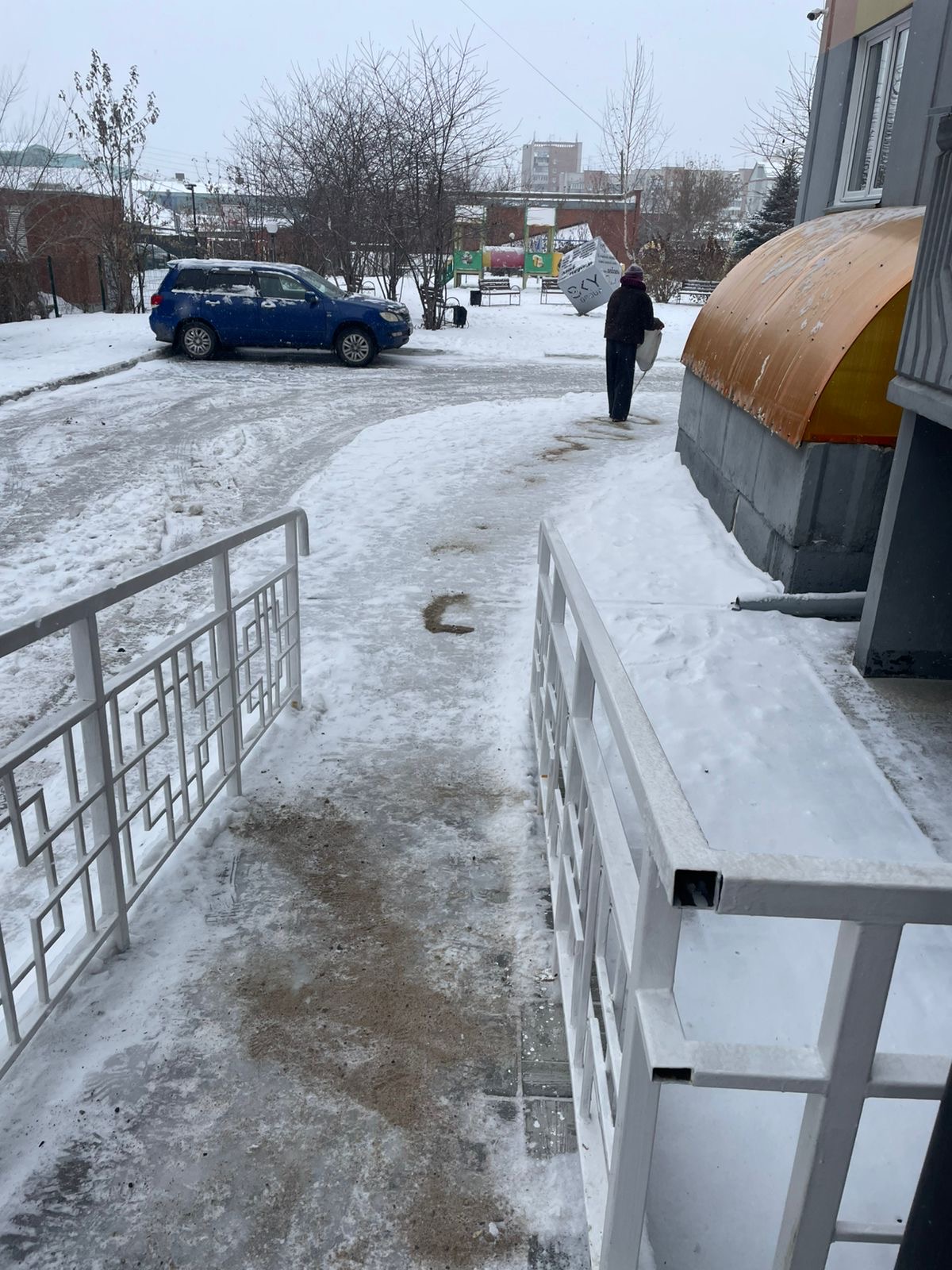 Поэтому, для того, чтобы ваши прогулки сегодня были более безопасными, мы обработали территорию противогололедными средствами.