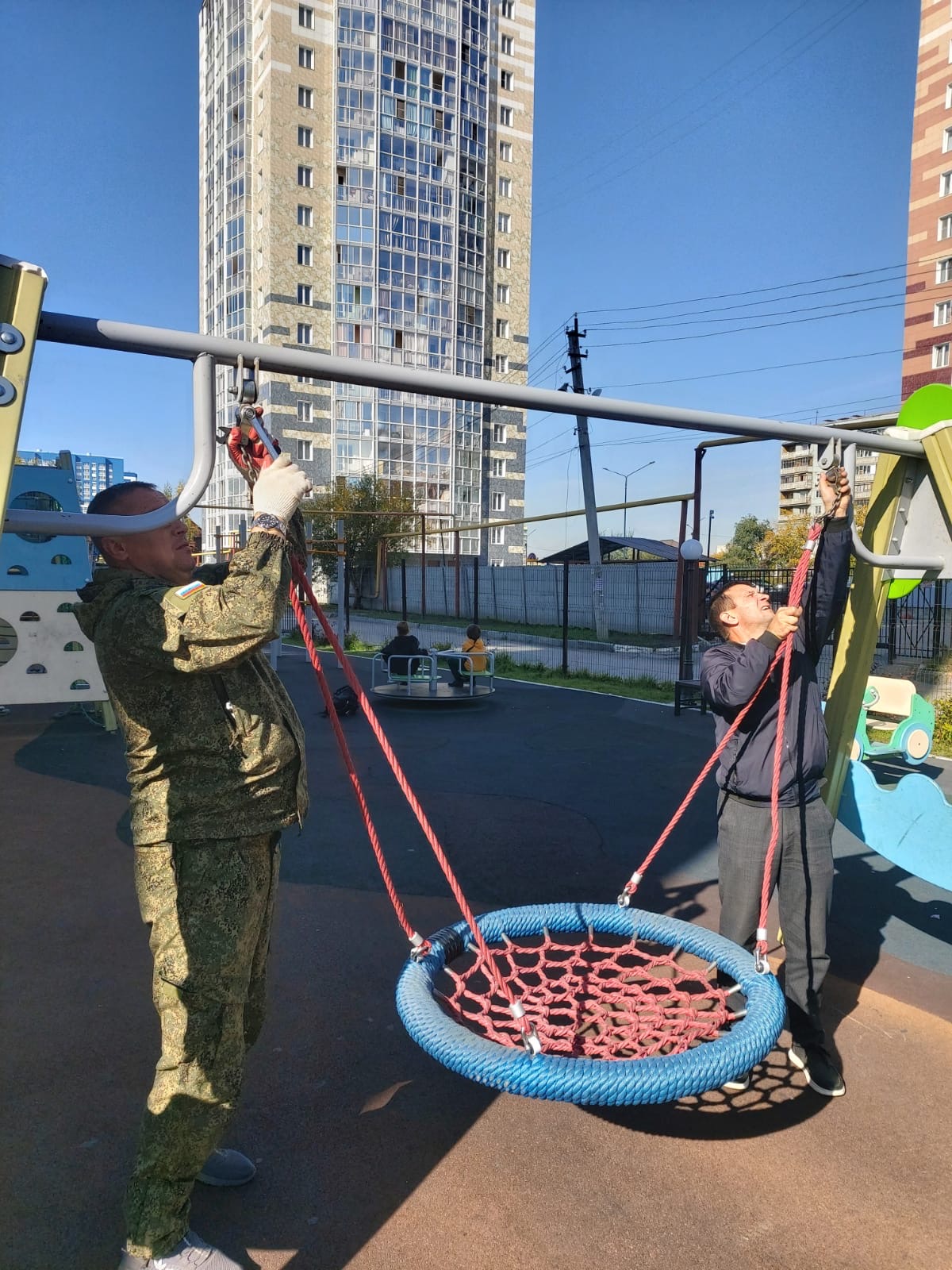 ➡️ Починили и поставили на место качели «гнездо»: Теперь оно как новое и на своём месте.