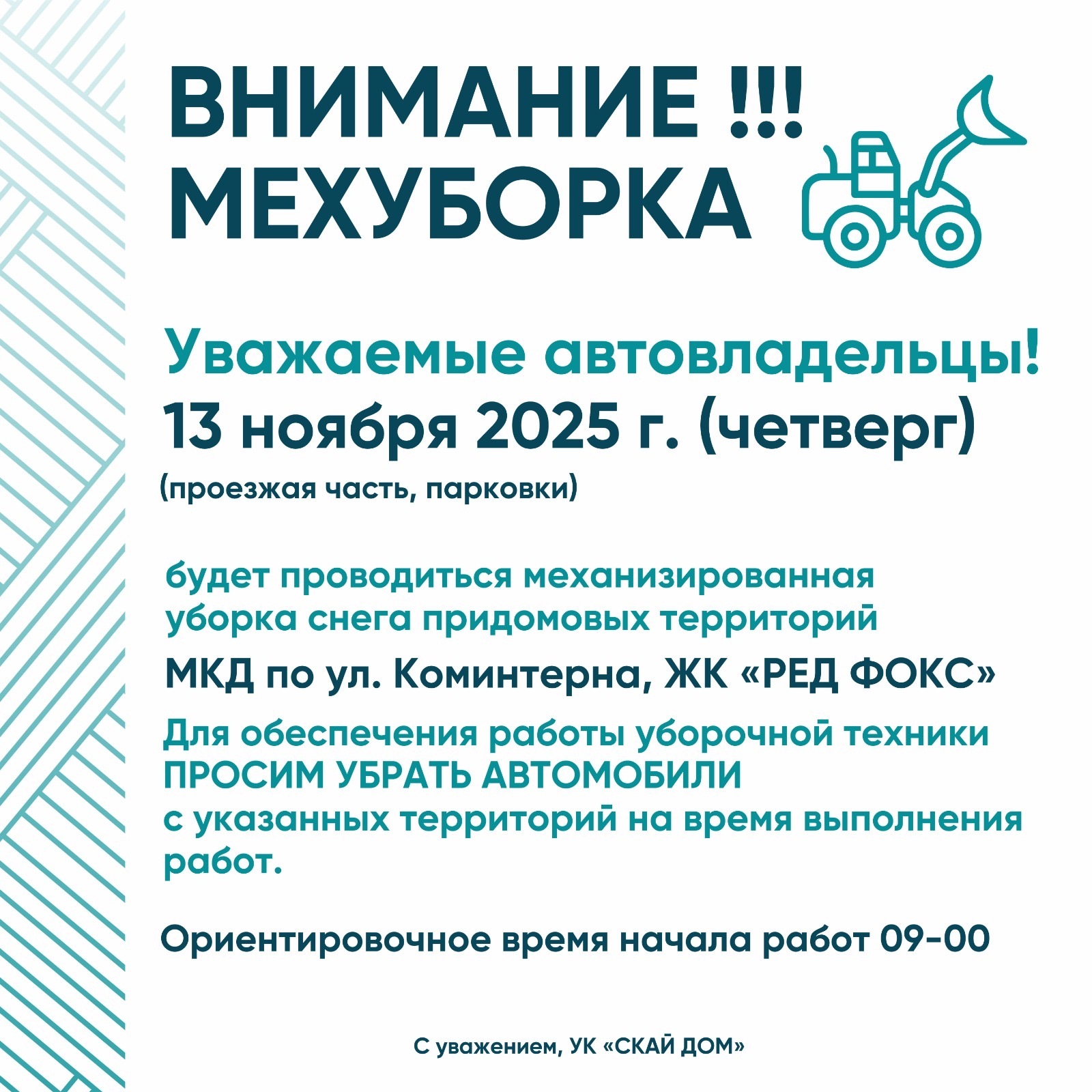 ПРОСИМ УБРАТЬ АВТОМОБИЛИ с указанных территорий на время выполнения работ.